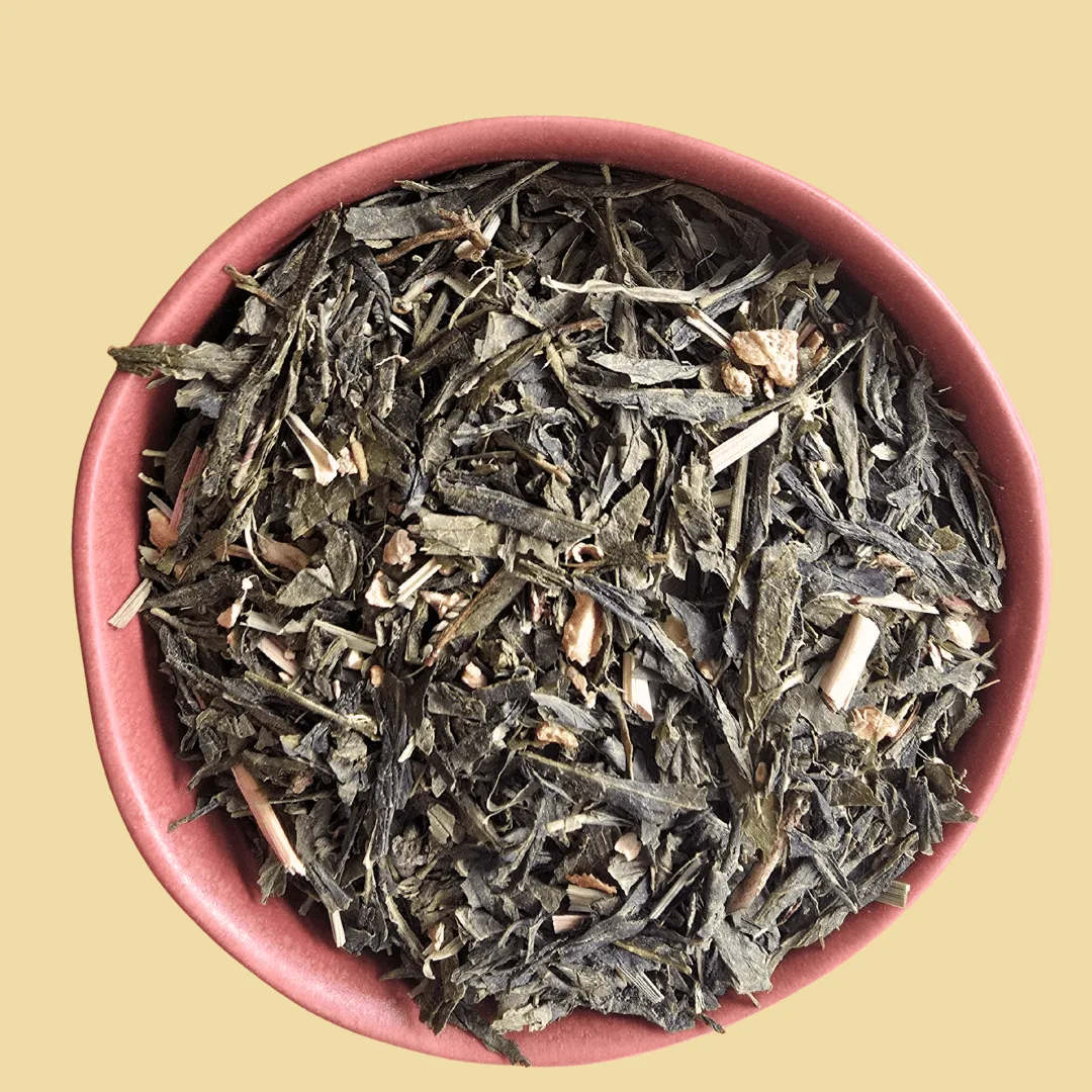 Ingredientes: chá verde sencha (camellia sinensis), pedaços de gengibre, casca de limão, erva príncipe, aromas naturais